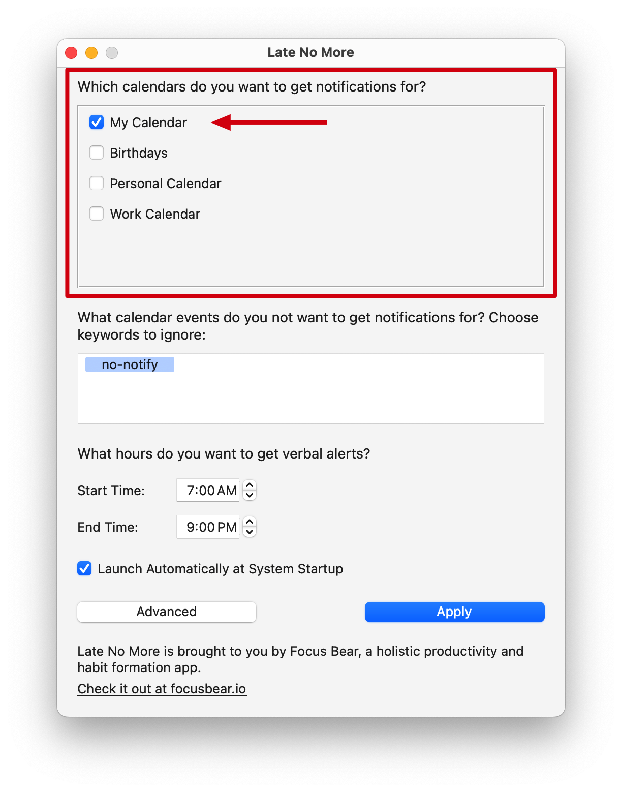In the Late No More app, the first part shows the calendars present in the Apple Calendar app on your Mac.